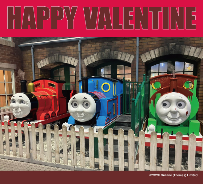 チョコレートパーシー HAPPY VALENTINE★ いまトーマスタウンではハッピーバレンタインイベント開催中!期間中、チョコまみれになっちゃったパーシーがみんなをお出迎え★期間限定チョコレートパーシーと記念写真を撮ろう! ただいま「トーマスシアタートレイン」ご乗車で、限定チョコレートパーシー切符がもらえるよ!遊びにきてね!