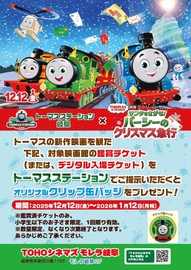 映画きかんしゃトーマス「サンタをさがせ!パーシーのクリスマス急行」を観た鑑賞チケット(または、デジタル入場チケット)をトーマスステーション岐阜でご提示いただくと、